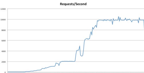 In summary, the results were very encouraging, but certainly not perfect. In my original post I alleged that ELB was flat lining at around 2k requests per second, unfortunately this was wrong, and was caused by me due to the way the testing clients were designed. Once I made the controller more reliable, made the load testing client not wait for connections to close, and replicated more realistic traffic growth, then when I ran the tests myself in my EC2 cloud I easily got to 10k requests per second, and so did Spencer (Amazon) with his tests using CloudFormation and the libraries described above. What we found is that ELB does seem to have unlimited scaling capabilities, however it doesn’t necessarily scale as fast as you want it to all the time. If you look at the graphs below, you will see plenty of dips where we would expect ELB to scale up horizontally to cope with more demand, yet it doesn’t until some time passess. Eventually ELB does catch up, but it’s worth bearing in mind that if you get spikes in traffic, latency will increase and potentially some connections may drop as ELB plays catch up.