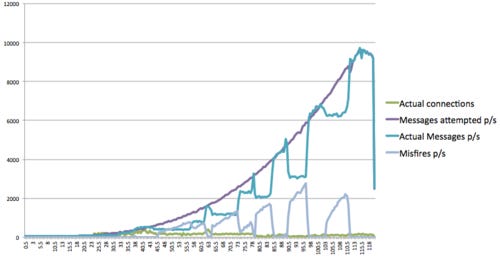 With the help of Spencer at Amazon, who was incredibly helpful throughout the entire process (which lasted more than 2 weeks), we managed to get to a point where we knew the tests were accurate, any bottle necks that we found were indeed ELB and not caused by other factors, and we could replicate our tests easily. Spencer set up CloudFormation templates (awesome stuff) so that we could spin up the servers and the load testing clients in the same configuration each time, and I worked on building a simple WebSocket server, a WebSocket testing client, and a controller app (based on Bees With Machine Guns) so that we could spin up any number of load testing clients we needed, and start a progressive and realistic attack on the load balancers. On Github you can find my core repositories for the WebSocket load testing client and server, and the modified Bees With Machine Guns that does not rely on SSH connections as I found these to be unreliable when you spin up more than 10 load testing machines (we went up to 80 c1.medium).