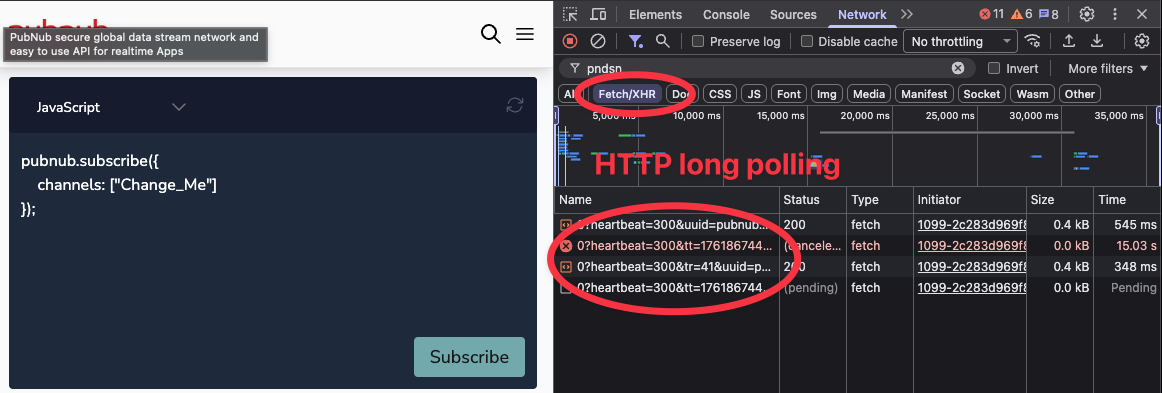 You can verify this yourself: Open browser DevTools → Network tab. Connect to a PubNub demo. You’ll see HTTP GET requests, not WebSocket frames.
