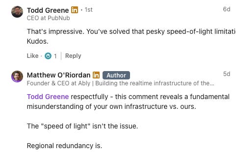 I expected we’d share technical post-mortems and move on. What I didn’t expect was PubNub’s CEO, Todd Greene, to publicly question our results, suggesting they were “impossible” and that we’d “solved that pesky speed-of-light limitation“