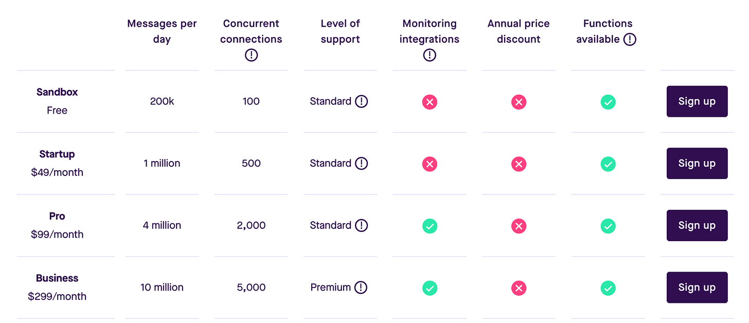 Example: Startup plan ($49/month) = 1M messages/day + 500 concurrent connections [1]